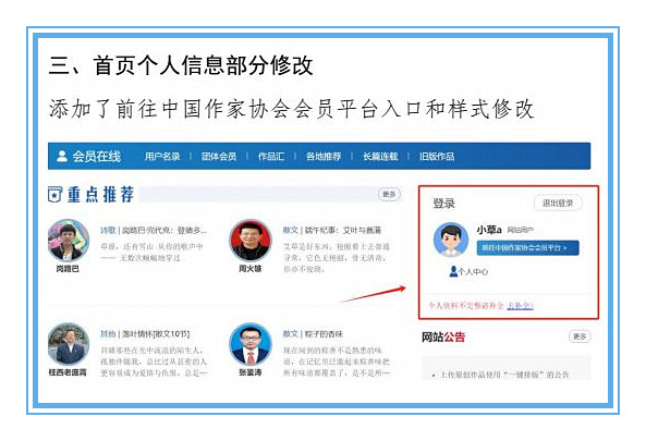 我們將于7月22日上線中國作協會員注冊系統,屆時原創平臺注冊和登錄頁面信息顯示會發生個別變化,但對注冊及登錄使用不發生影響。我們以圖片示例形式(見下圖一、二、三、四)將頁面變化公告如下,請知悉。
