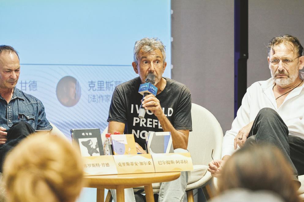 美國詩人弗羅斯特·甘德、匈牙利小說家巴爾提斯·阿蒂拉和法國作家克里斯蒂安·加爾桑在2024上海國際文學周中,以“跨越故事邊界,連接人與世界”為主題展開一場作家圓桌談,他們基于各自的創作經驗,面對上海讀者,共同探討了語言變遷、科技發展和經濟因素對文學的影響。(均主辦方供圖)