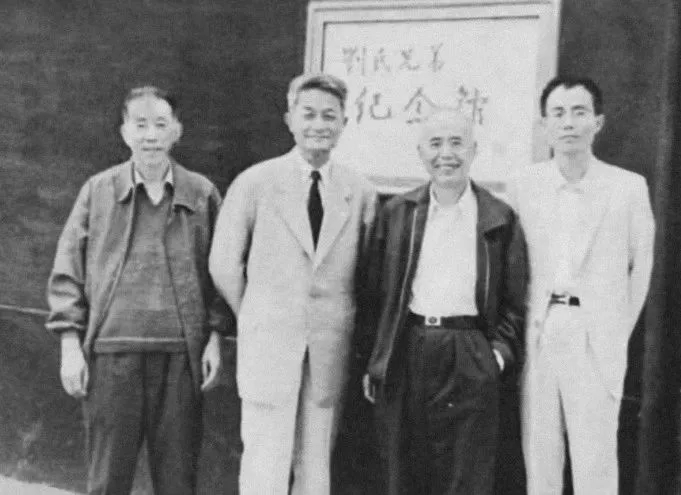 1991年5月,攝于江蘇江陰劉氏兄弟紀(jì)念館前,左起:丁景唐、徐中玉、錢谷融、陳子善