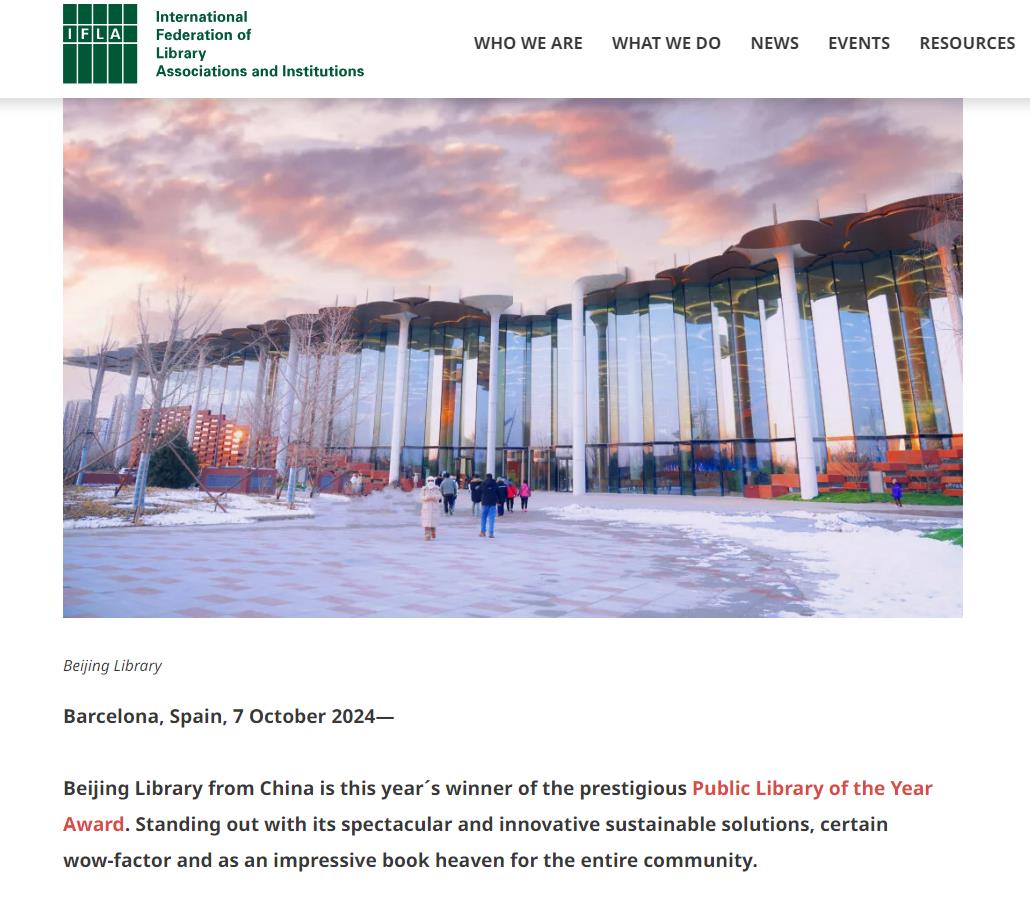 北京城市圖書館榮獲國際圖聯(IFLA)2024年度公共圖書館獎