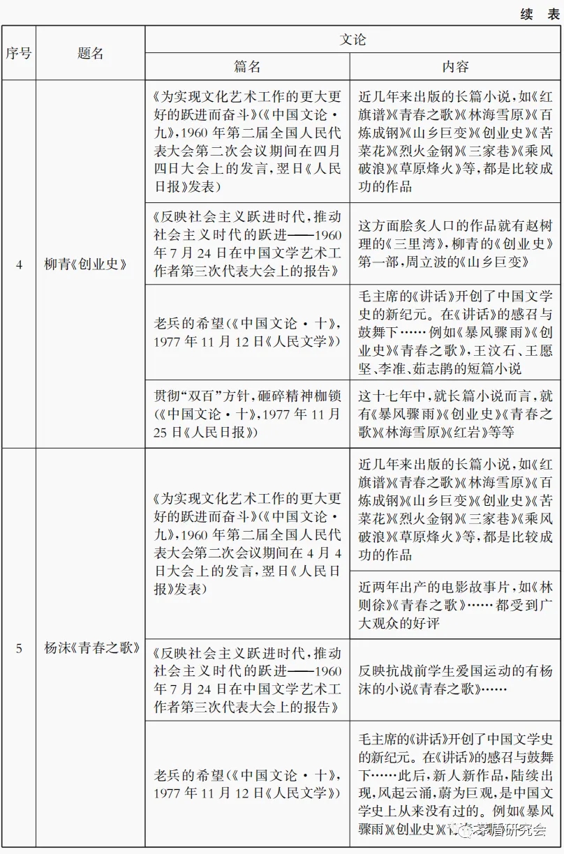 由表4可知,關于《紅巖》的提及是最少的,梁斌《紅旗譜》則較為頻繁,在一次報告中三次提及,關于曲波《林海雪原》提及時間跨度最長,最早在1958的《談青年業余創作——在沈陽市青年業余作者大會上的講話》(《中國文論·八》,1958年《文學青年》第七期),最晚為1977年的《貫徹“雙百”方針,砸碎精神枷鎖》(《中國文論·十》,1977年11月25日《人民日報》)。