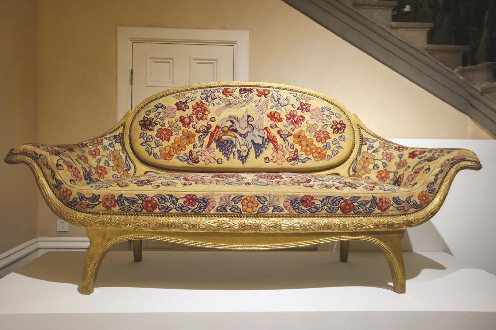 從大木箱中緩緩移出的一件金色歐式扶手椅,是其中一件,鎏金櫸木材質(zhì),包裹著絲絨面料,呈現(xiàn)出繁復(fù)的裝飾圖案,拉滿“潑天的富貴”感。這是法國國家家具管理館珍藏的“金鳥”系列家具之一,曾華美亮相1925年舉辦的巴黎國際裝飾藝術(shù)與現(xiàn)代工業(yè)博覽會,集兩位藝術(shù)家的智慧結(jié)晶于一體。其木構(gòu)造型,由法國裝飾藝術(shù)家、室內(nèi)設(shè)計大師阿爾芒-阿爾貝·拉托完成,結(jié)合新古典主義元素與現(xiàn)代構(gòu)型,日后它也成為最具代表性的家具構(gòu)型之一。而其織錦部分,則由深受“納比派”和“野獸派”影響的法國畫家勒內(nèi)·皮奧繪制,由創(chuàng)立于1664年、曾為皇家掛毯織造機構(gòu)的博韋掛毯廠完成織造。在此次展覽中,觀眾不僅能見到這件“金鳥”系列的扶手椅,還將邂逅該系列的屏風(fēng)和兩把扶手椅。