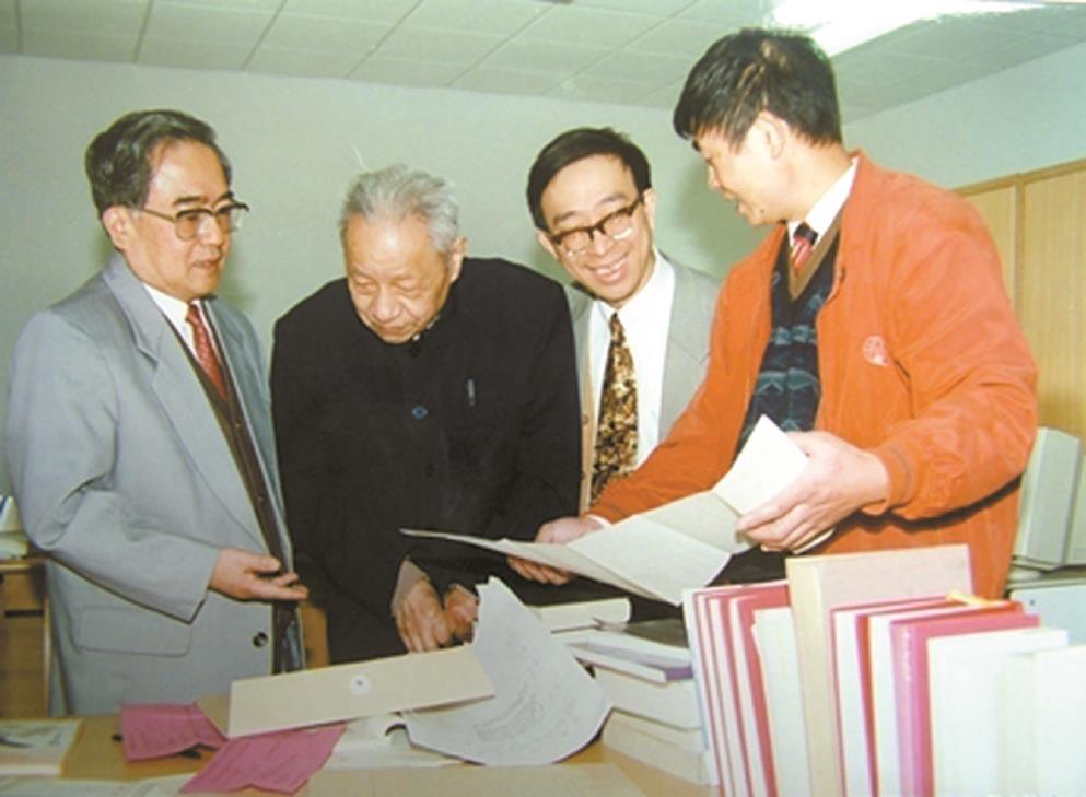 顧廷龍(左二)在指導(dǎo)“盛檔”整理工作。右一為馮金牛,右二為陳燮君,左一為本文作者