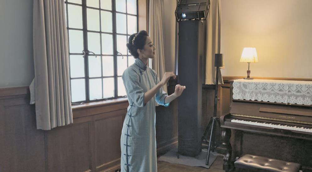 邁進夏衍舊居的馬蹄形門洞,夏衍的文字鋪滿前廳的天花板與主墻面,其所作《野草》的誦讀聲響起,這樣一道聲音景觀引人們進入一場輕巧別樣的沉浸式體驗??蛷d的留聲機中響起舞曲,一支《梧桐影韻》引用了上海老歌的流行曲風,詞曲卻是全新創作,講述了對這片充滿歷史記憶和音樂底蘊的城市街區的回憶。原來,這部作品由上海國際數字音樂周藝術總監、作曲家,上海音樂學院安棟教授領銜擔綱創作,攜手上音數媒學院的戴維一副教授、董天晟,以及音工系房大磊副教授、音樂劇系的馬良導演、上海工程技術大學蔡張藺等青年教師共同主創。融合人工智能(AI)和擴展現實(XR)等前沿科技,將上海的城市文化記憶以全新的方式活態呈現。