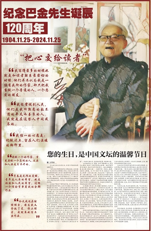 在巴金故居、巴金書房、巴金圖書館,在巴金學術研討會、青年作家座談會,在地鐵的文化長廊,我們在上海不同的場域,以不同的方式,共同紀念人民作家巴金的120周年誕辰。感謝先生留給我們一種與時代同行的精神探索,一種直面現實的思想狀態,一種青春在場的生命熱能,一種與人民同心的文學魅力。他對世界深沉的愛與思索,讓我們在砥礪前行中倍感鼓舞與溫暖。