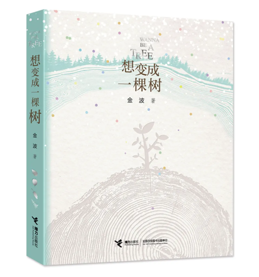 很“樹”的封面:凹凸有致的外封由樹的年輪蕩漾開去,木質感歲月感十足的某一圈年輪萌生出一棵小樹,只有五六根短短的枝條上面幾片小小的葉子,一如耄耋之年的金波靈魂深處的童年。在經歷若干“空白”的蕩漾之后,細密的年輪之外是一片茂密的森林,無數絢麗的點點零散地點綴著整個畫面:璀璨如星、繽紛如雪、彌漫如思……更似金波與樹之間的對話——WANNA BE A TREE——《想變成一棵樹》。外封的背面是一片綠色:無盡的森林——你自然地被融進去了,情不自禁地深深吸上一口氣:我也想變成其中的一棵。