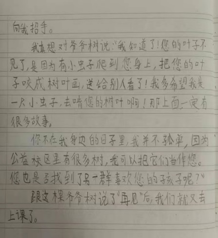 我將自己的體會寄給了金波老師,沒想到不僅得到了他極大的認可,稱我是這首詩的知音,還鼓勵我是一位懂孩子懂詩歌的老師。于是,我就立足指導孩子讀詩寫詩這一視角,解讀著先生的詩,合作而成了《金波寫詩的秘密》(天天出版社出版)。一切只因我也是那鳥巢里的一員,在回應這棵知鳥音、懂鳥心的樹。隨后相繼合作了《書本里的蜜》《金波的寫作課》,還成了他經常點名的作品導讀人,先后導讀過他的許多作品:《開開的門》《婷婷的樹》《風箏鳥》《柔軟的陽光》……就這樣,那一串串楓楊樹的種子,就像金波的一串串詩行,又像他童話里的精靈,陪伴著孩子們度過一個又一個美好的日子,飛越一段又一段光陰:2021年秋到2023年春,兩年時間里,我們幾乎天天在讀金波,午間聽《影子人》里的童話,清晨讀《讓太陽長上翅膀》里的童詩,讀著讀著,就忍不住寫出了自己的作品。到了三年級,孩子們要從龍山校區轉往公益校區去讀三、四年級,孩子們最舍不得的就是楓楊樹。思念,觸發了他們的靈感,于是,他們用自己稚嫩的筆給金波寫信,分明是楓楊樹的種子在發芽:
