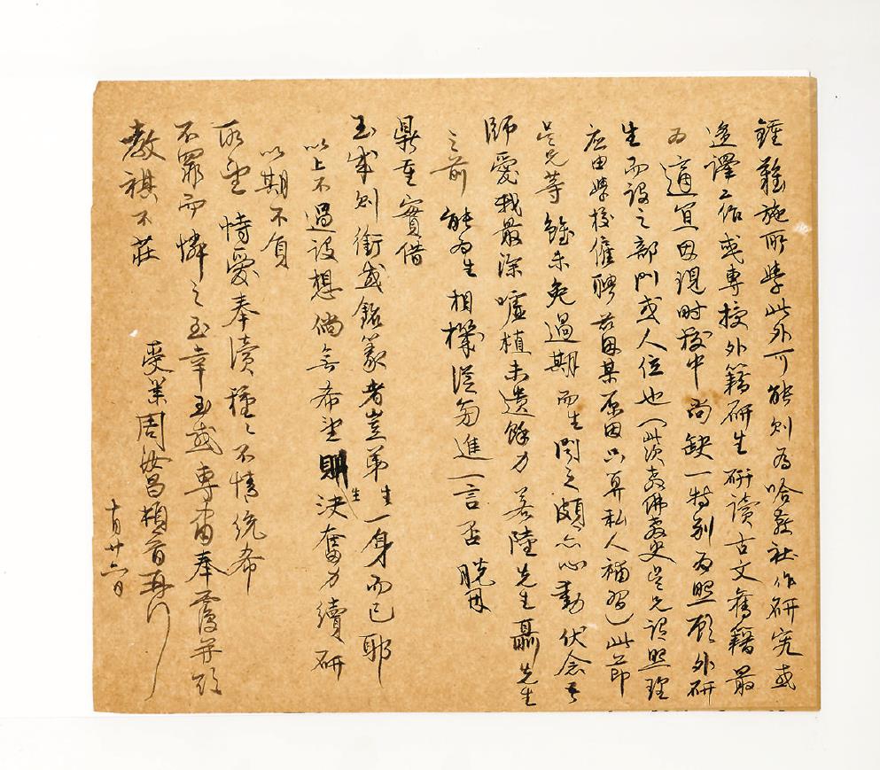 拜登手示,展誦殷拳,備荷關垂,藏寫無既。生日內覓便必造謁高先生一洽,結果若何,容當奉報。生紅桑碧海,眼易三朝;玄鬢青衿,山艱一簣。家衰親老,仰事莫由。誦菽水而摧膺,感風木以銜懼。常因遲暮,抱恨無成。近者蒙同窗吳允曾兄、孫錚弟等熱心介紹,教外籍研究生佛教史,聊資濟助,境遇可望稍佳。復承吳兄考慮是否有被校方留用之可能,生私自度目前情況,事畜實迫于攻研,吳兄謂西語系現雖需要師資,而大一英文似非生興趣所鐘,難施所學。此外可能則為哈燕社作研究或迻譯工作,或專授外籍研生研讀古文舊籍最為適宜,因現時校中尚缺一特別為照顧外研生而設之部門或人位也(此次教佛教史,吳兄謂照理應由學校雇聘,茲因某原因只算私人補習),此節吳兄等雖未免過期,而生聞之頗亦心動。伏念吾師愛我最深,噓植未遺余力,若陸先生、聶先生之前,能為生相機從旁進一言否?脫因鼎重,實借玉成,則銜感銘篆者豈弟生一身而已耶?以上不過設想,倘無希望,則生決奮力續研,以期不負所望。恃愛奉瀆,種種不情,統希不罪而憐之,至幸至感。專肅奉覆,并頌教祺!不莊。