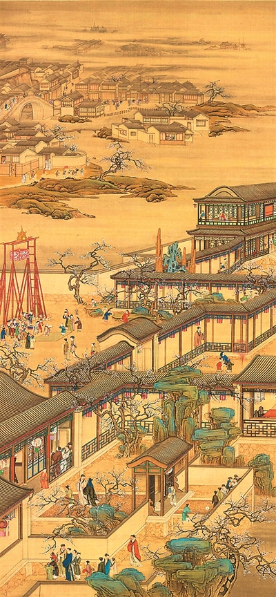 清代宮廷院畫《十二月令圖》之一(臺(tái)北故宮博物院藏)更為細(xì)致地描繪了宮廷中元夕觀賞燈彩的景象。《十二月令圖》是清朝宮廷佚名畫師所繪,畫的是四時(shí)流轉(zhuǎn),民俗節(jié)令的獨(dú)特風(fēng)物,其中第一幅是“正月觀燈”。該幅畫作采用中西融合的透視法繪制,以一片湖水將畫面分成近景和遠(yuǎn)景,近景處最打眼的是一盞天燈。清宮通常過大年才會(huì)立這種天燈、萬(wàn)壽燈。天燈就是懸掛在高處的照明燈,民間、宮廷皆有,只是宮廷的天燈更加華麗,圖中一盞四面裝飾紅地青龍紋的花燈高掛在燈棚上,燈下童子正在嬉戲。廊檐下也布置懸掛了各式宮燈,人們?nèi)宄扇海┎迤溟g,或觀燈,或賞梅……宮廷畫師精心描摹,渲染出一種極為喜樂的氣氛。圖中遠(yuǎn)景仿佛走出了宮闕,來(lái)到市井:一座單拱橋上匯聚了不少人,這是元宵節(jié)一些地區(qū)“走百病”的風(fēng)俗。元宵時(shí)節(jié),寒冬已過,暖意漸濃,正是活動(dòng)筋骨的好時(shí)候,有了好身體,才能驅(qū)走百病,這正是老百姓樸素的愿望。