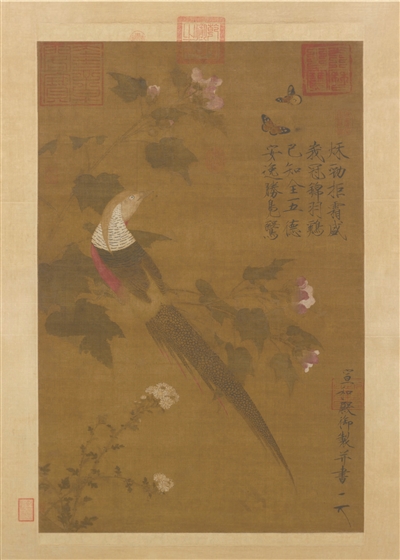 毫無疑問,祥瑞是古代政治文化中的重要元素。無論是真實存在的動物,還是想象的動物,都披上了一層神秘的色彩,它們的出現象征著上天對君王身份的認可,對他們功績的表彰。因此,古代帝王喜歡借祥瑞的圖案宣揚其政績,其中最為不遺余力者當屬宋徽宗趙佶。在他創作的《瑞鶴圖》中,群鶴盤旋宮殿之上,引以為祥瑞之兆,本展中也選了一幅他的《芙蓉錦雞圖》,顏色鮮艷的錦雞棲于芙蓉枝頭向上眺望,周圍是花團錦簇蝴蝶翩翩,甚是熱鬧。