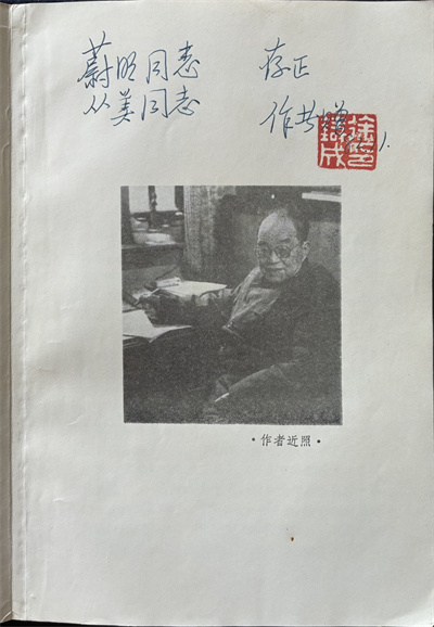 徐鑄成是文匯報的創辦人之一,1957年以后離開了《文匯報》,晚年曾來參加過《文匯報》的活動,依稀記得見過他的一個背影。手頭這本徐鑄成簽贈給謝蔚明的《杜月笙正傳》,浙江人民出版社,1982年6月第一版,是我幾年前在舊書店淘到的。在“作者近照”的上方,徐鑄成鋼筆題寫:“蔚明同志、從美同志存正。作者贈,82.11.”鈐白文“徐鑄成印”。