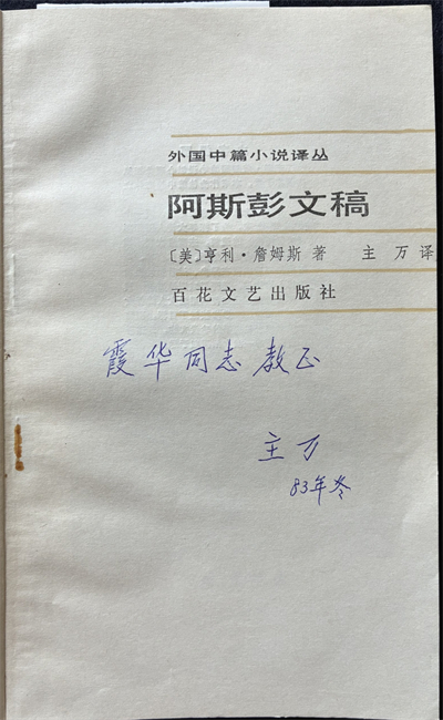 我買到的這本《阿斯彭文稿》,書名頁有譯者主萬的題詞:“霞華同志教正。主萬,83年冬”。霞華應該就是譯者曾經的同事、華東師范大學外文系教授楊霞華,錢谷融的太太。錢谷融先生是很熟悉的,以前好多文學活動都能見到他,慈眉善目、笑容可掬。而這位楊教授我無緣識荊。曾在吳俊的《追思我的導師錢谷融先生》一文中讀到,他們師生倆有次談到戀愛問題,錢先生對吳俊說:“我也有苦惱啊,楊先生有時發起脾氣來,會過來揪著我的耳朵從這個房間拉到那個房間。”吳俊寫道:“楊先生是我的師母,華東師大外語系的資深教授,年長先生四歲,師母任副教授時,先生還是小講師。……我在先生家里,多次聽到隔壁楊先生直呼先生的名字,而先生說起師母則總是楊先生三字。”(黃平主編《師大憶舊(華東師大卷)》,江蘇鳳凰文藝出版社,2022年1月版,73頁)