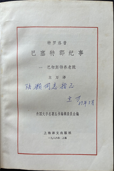 主萬先生與我卻有過一段交往。上世紀八十年代后期,我采訪了多位滬上老翻譯家,曾去華山路主萬先生府上拜謁,聽他介紹剛完成翻譯的英國作家特羅洛普。主萬先生在上世紀五十年代曾翻譯了特羅洛普長篇小說《巴塞特郡紀事》的第一部《巴徹斯養老院》,三十年后又完成第二部《巴徹斯特大教堂》的翻譯。我在介紹文章中說這部小說“給了我們一些比民族性更廣泛、更深遠的東西,最終是來源于對人類的一種透徹、全面的認識與了解”,肯定是主萬先生說的話。《養老院》和《大教堂》收入“外國文學名著叢書”,分別于1986年6月和1987年1月由上海譯文出版社出版,主萬先生都簽名送了我。