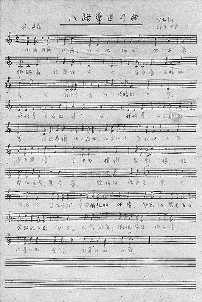 沒有鋼琴和手風琴,鄭律成用手打拍子、用口哼唱找感覺。他有時繞著白茬桌子踱來踱去,有時干脆跑到山坡上或深山溝底去創作。有一次,鄭律成從山上回來,公木發現他手流血了。原來,他靠雙手擊打石子找節奏,邊想邊敲,不小心敲破了手指……9月,譜還沒制完,鄭律成調轉魯藝音樂系任音樂教員。等他在魯藝譜完全曲時,已是10月了。
