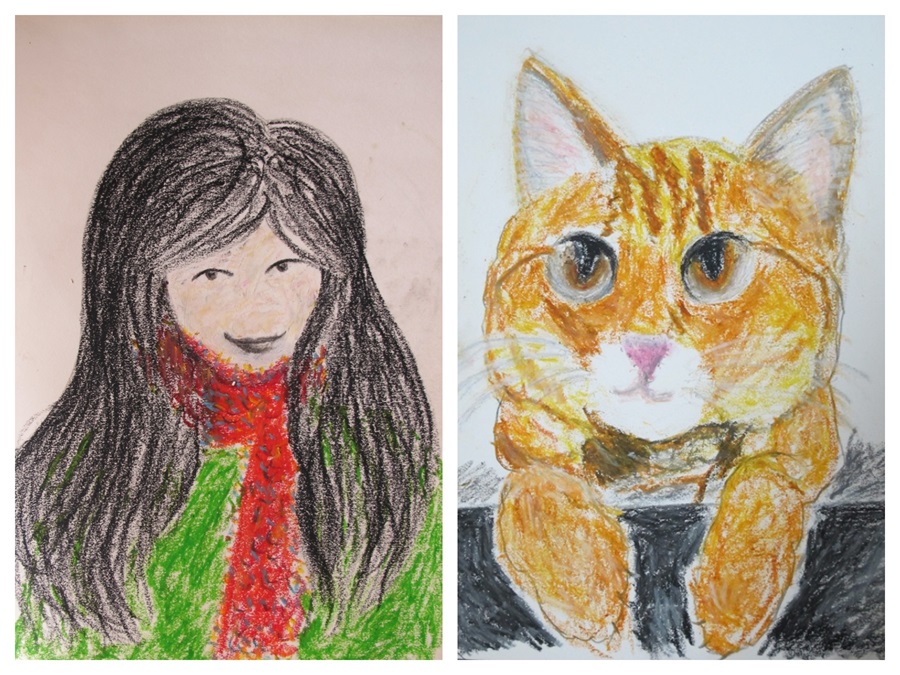 污士奇給仙人球愛水(左)和自己畫的頭像