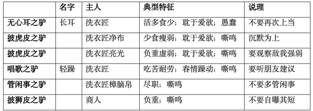 《伊索寓言》中有十幾個關(guān)于驢的故事,在內(nèi)容的豐富性上遠勝印度,驢的形象也更加多元。其中,一個情節(jié)類似的故事是“驢和獅子皮”:驢披上獅皮嚇唬眾獸,狐貍因聽過其叫聲而看破其身份。其余有關(guān)驢的故事大體可分為數(shù)類: