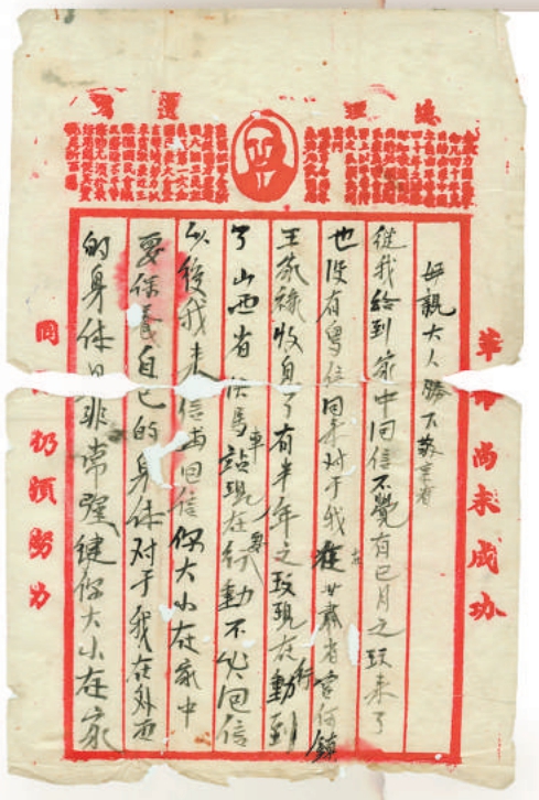 劉中新大概在上世紀二十年代末期參加紅軍,經長征到達甘肅、陜北,后在八路軍115師政治部和343旅工作。據初步考證,此4封信分別寫于1937年9月7日和1938年6月至9月間。其中的第一封家書寫于山西侯馬,當時紅軍剛剛改編為八路軍。1937年9月2日,115師由陜西三原出發進入山西境內,在侯馬稍作停留,即北上晉東北抗日前線,9月25日發起了平型關戰役。劉中新在這封家書中說:“從我接到家中回信,不覺已有月之久來了,也沒有寫信回來。對于我在甘肅省宮何鎮王家祿收(休)息了有半年之久,現在行動到了山西省侯馬車站。現在要行動,不必回信,以后我來信再回信。你大小在家中要保養自己的身體,對于我在外面的身體是非常強健,你大小在家不必掛念……現在是全國動員抗戰的時非(候),我在外都是為了抗日救國,不能在家來孝順母親大人,以后回家再來孝順母親大人。現在我在國民革命軍第八路軍一百一十五師政治部工作……”