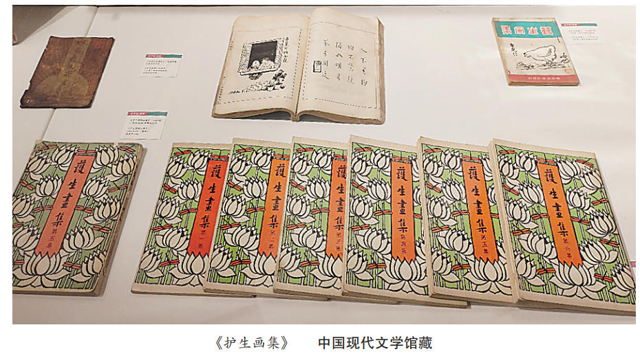 《護生畫集》便是藝術與宗教相逢的見證,以畫與文的配合倡議世人敬畏生命。如展柜中樣書所示,《護生畫集》共六集,前一、二集為豐子愷與弘一法師共同完成,內頁并置豐子愷所繪漫畫與弘一法師的配詩題字?!蹲o生畫集》于1927年緣緣堂中商定并開始編繪工作,第一冊共50幅,于1929年出版。1939年,豐子愷為紀念弘一大師六十壽辰著手繪制《護生畫集》續集,病重的弘一法師勉力完成書寫工作,次年《續護生畫集》由開明書店出版。然而在動蕩年代,“護生”的倡議遭受多方質疑,豐子愷的文章亦陷入爭議。1930年,有人指責豐子愷隨筆的詩意不合時宜,而《護生畫集》更是“荒謬與淺薄”;1938年,柯靈刊載豐子愷寄給友人的書信,豐子愷在信中提及的“因禍得?!保ㄐ蕾p桂林山水)遭到批評;1938年豐子愷以《一飯之恩》直接回應對《護生畫集》的片面理解,從“護生就是護心”向“我們是為護生而抗戰”展開論述,這篇文章起因在于其聽聞曹聚仁對《護生畫集》的不滿,而曹聚仁后來亦談及兩人在“護生”與戰爭關系上的分歧。
