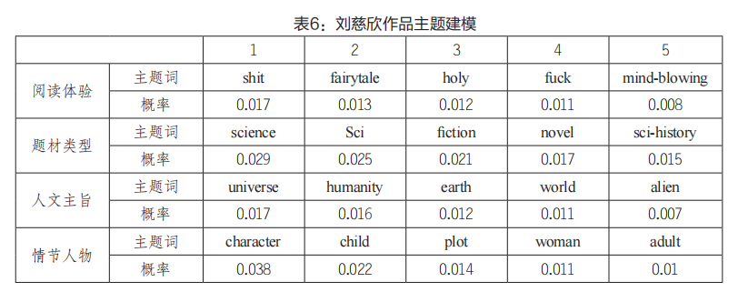 根據表6所示,劉慈欣的作品主題主要包括閱讀體驗、題材類型、人文主旨、情節人物、文化背景和翻譯技術等六個方面。讀者對劉慈欣作品的閱讀體驗既有積極評價也有消極評價,如主題中的正面詞匯“fairytale”“holy”“mind-blowing”,以及負面評價詞匯“shit”“fuck”,表明讀者對作品的評價和偏好存在主觀差異。其他的五個主題基本上是正面評價為主,劉慈欣作為中國科幻小說的代表,對海外讀者產生了強大的吸引力。主題詞中“world”“universe”“ sci-history”等主題詞反映了現實與科幻的關系,引發了讀者對地球的敬畏、對文明的思考等人文關懷,深受讀者喜愛。此外,“character”“plot”“civilization”“translation”等主題詞反映了小說中人物塑造的方式、文化背景、翻譯質量等方面,體現了讀者對作品關注的視角。