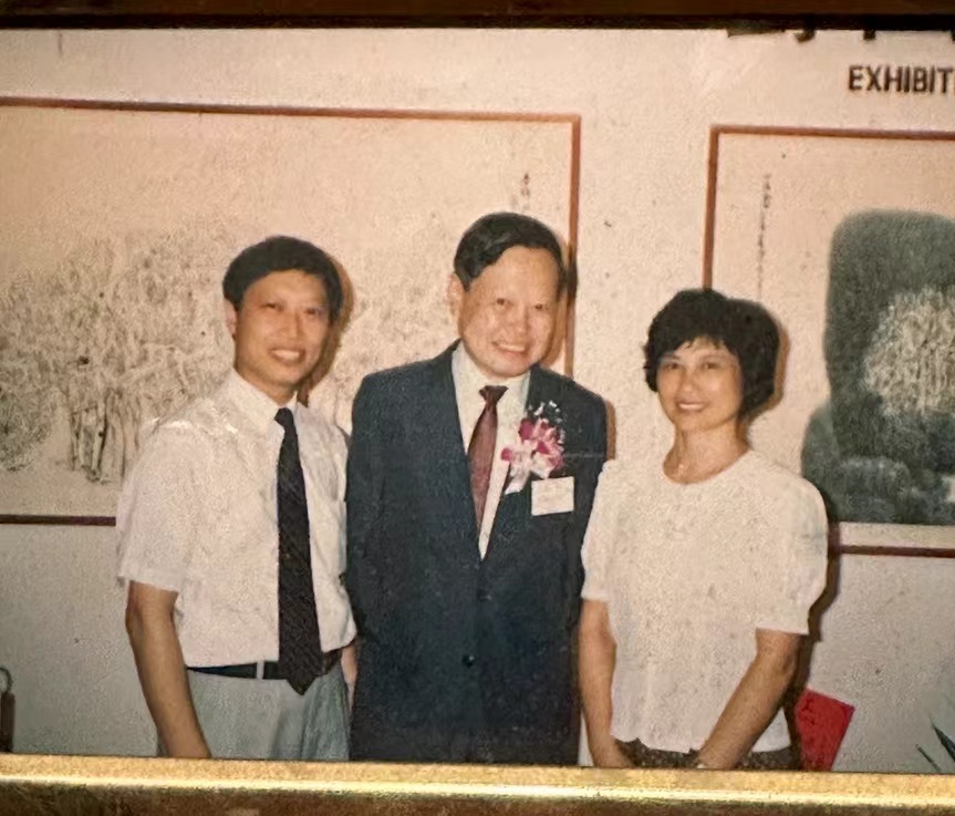 1991年楊振寧教授在香港心源畫廊和沈津、沈太太趙宏梅合影