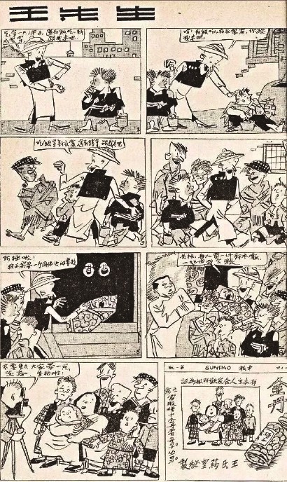 1934年,具有明星潛質(zhì)的“王先生”形象,被上海天一影片公司老板邵醉翁慧眼識(shí)得,改編拍攝了滑稽電影《王先生》,一夜躥紅。此后,影壇連珠炮似的涌現(xiàn)了11部系列影片,諸如《王先生的秘密》《王先生過(guò)年》《王先生吃飯難》《王先生奇?zhèn)b傳》《王先生夜探殯儀館》等,后期的影片基本脫離了漫畫(huà),但沿用原作的人物關(guān)系,插科打諢,荒誕不經(jīng),越編越離譜。