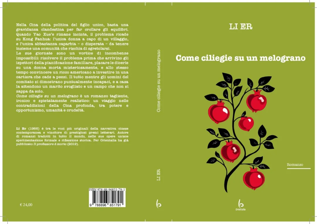 2025年《石榴樹上結(jié)櫻桃》意大利語版也問世。這次的封面采用了深綠色作為主色調(diào),給人一種自然、樸實、甚至帶點沉靜的感覺。它與石榴的紅色形成鮮明對比,同時也賦予了畫面一種有機的、泥土的氣息,與農(nóng)村背景相呼應(yīng)。同時,畫面中心是一棵具有木刻版畫風(fēng)格的石榴樹。木刻版畫在現(xiàn)代中國是一種非常重要的藝術(shù)形式,常被用于民間藝術(shù)、年畫和宣傳畫,甚至1930年代興起的木刻運動也成就了左翼美術(shù)運動的主要風(fēng)格。[25]這些視覺構(gòu)圖傳達(dá)出農(nóng)村、左翼、民間等元素,并且呈現(xiàn)一種更具藝術(shù)性和經(jīng)典感的設(shè)計。雖然書名有“櫻桃” 兩字,但畫面上結(jié)的是紅色的石榴果實。這是一個非常有趣且關(guān)鍵的設(shè)計選擇。它似乎回避了英文版那種輕盈而荒誕的視覺構(gòu)圖,而是選擇了一種更為內(nèi)斂、象征性的表達(dá)。不過,跟英文版一樣,設(shè)計者在紅色石榴里面暗藏了嬰兒的圖案。整體而言,意文版的封面更像是一個藝術(shù)典藏品。
