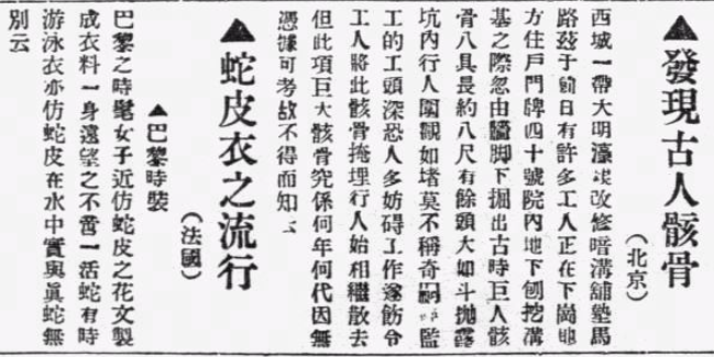 將這則報道放大,其內容確如《長狄考》一文中所述。只不過這樣一則在歷史學家眼中屬于重要古代遺跡發現的報道,和《蛇皮衣之流行》放在了一起。以今天的眼光看,其嚴肅性是要大打折扣的。