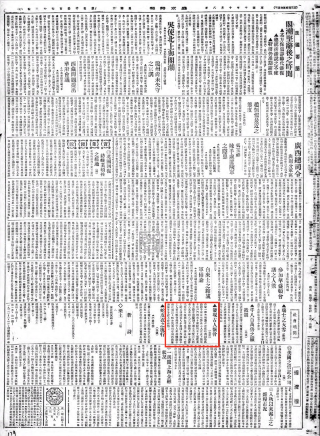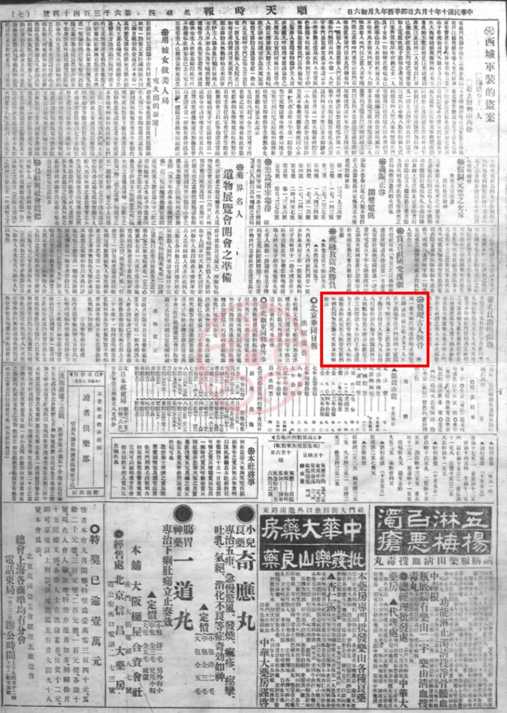 當我們找到當天的《盛京時報》,就會有一種豁然開朗之感。下圖是呂思勉先生提到的“民國十年十月八日”(1921年10月8日)的《盛京時報》第七版,北京大明濠發現巨人骸骨的報道就刊發于這個版面,占據了該版偏下部非常小的一塊空間。