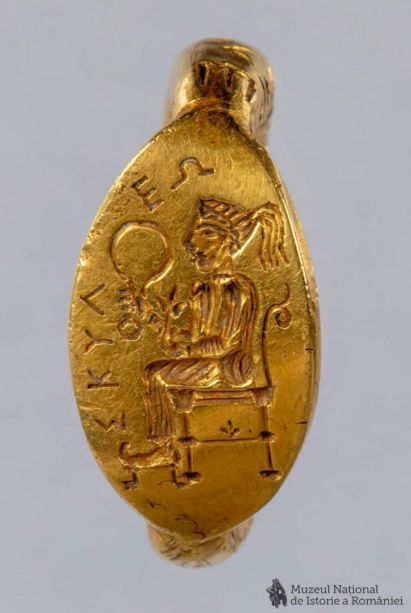 在奧爾比亞,希羅多德描述了王子斯庫勒斯(Scyles)的故事。斯庫勒斯出身于草原上的斯基泰王室。在草原上,他是馬背王子、祭祀和部族的首領。王子在奧爾比亞擁有一處城市宮殿。在宮殿里,他講希臘語,娶希臘人為妻,披著希臘式的長袍。王子在城里是希臘人,出城則變成斯基泰人。然而他并不滿足于只是扮演希臘人,在節慶時參加狄俄倪索斯秘儀(Dionysian order),隨眾人酒神狂歡。在斯基泰同族眼中,這意味著越界——等同于公開放棄草原戰士的身份成為一名希臘人。當族人將城中所見傳揚至草原社群時,斯庫勒斯被褫奪王位。王子往西南方向逃遁,向居于多瑙河西岸的色雷斯人尋求庇護。色雷斯人很快背叛了他,將其作為人質押回草原。公元前五世紀,斯庫勒斯在河岸被兄弟處死。1930年代,考古學家在位于多瑙河入黑海的河口希斯特里亞城(Histria,今日羅馬尼亞境內)發現過一枚有印有斯庫勒斯(Skyleo)字樣金戒指。此物如何流轉至希斯特里亞城,已不可考,但從形制判斷,極有可能屬于斯庫勒斯本人——這是一個罕見的,可以明確指向具體歷史人物的考古發現,現藏于羅馬尼亞國家博物館。