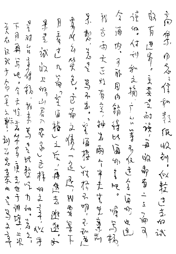 信和報紙收到,似較過去的試版有進(jìn)步。主要是耐讀,每版都有二三篇可讀的。副刊和文摘、廣?(不可辨認(rèn),應(yīng)是告字)等不僅適合海外,也適合海內(nèi)。可能國內(nèi)銷得比海外多吧。囑寫稿,我這兩天正好有空,抽出兩個半天坐在案前呆想,總是寫不出?!巴恰毙愿癫幻?,不知道要什么貨色。這篇文債一定還,我要等下月看過幾篇“望海樓”之后,再進(jìn)去逛逛。如果是試版上的“山君入農(nóng)家”這樣的文章,似乎是對臺宣傳稿,我來寫是比較吃力的??傊?,下月再寫吧。今天驚悉華羅庚去世于講壇,上次關(guān)在漢死于命筆之際,劉公思慕也是寫文章出了事的。因此,我最近也慣于對號入座,看到報上死了一個人,我就聯(lián)想到自己的心絞痛,因而太傷腦筋的文章就不“敢”拼命寫。貪生怕死的心情只好與老友談之,后生小子們是不能理解的。上海已入黃梅,陰陰陽陽,半陰半陽,氣悶之至,各報都在“大換班”,也有點黃梅天氣一樣,新民也不例外,《大好時光忙些啥?》我覺得有許多不必要的“忙”偏是自己找出來的。忝為老朽,當(dāng)然以少說為佳。匆復(fù)并致意于高汾女士。