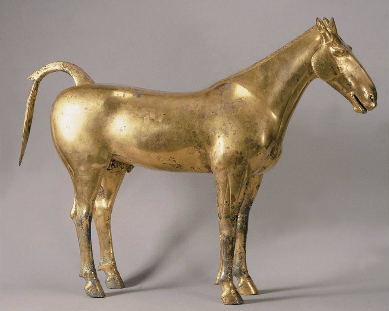 出土的漢晉文物中多見銅馬,其中制作精良者往往被認為就是文獻中記載的馬式。例如1981年陜西咸陽平縣茂陵從葬坑出土得一件十分精美的鎏金銅馬,身長76厘米、高62厘米。