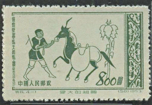 新中國郵票上最早出現的“文物馬”源自敦煌壁畫。1953年9月1日,郵電部發行了一套《偉大的祖國》特種郵票,旨在向廣大民眾介紹敦煌文物。這套郵票共4枚,其中第一枚便呈現了“馬”的形象。