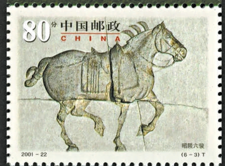 2001年10月發行的《昭陵六駿》特種郵票,全套6枚,圖案分別展示了什伐赤、青騅、特勤驃、颯露紫、拳毛騧和白蹄烏這六匹唐太宗的座駕形象。這六駿原本陳列于唐太宗昭陵的北闕,是刻在六塊青石上的浮雕。如今,四駿的原石收藏于西安碑林博物館,剩余兩駿(颯露紫與拳毛騧)則存于美國賓夕法尼亞大學博物館。由于盜賣者的嚴重破壞,這六駿已傷痕累累。該套特種郵票采用原物真實再現的手法,未對歷史損傷痕跡進行修飾。