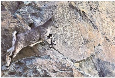 陽光照進寒風凜冽的賀蘭山谷,增添了幾分暖意。矯健的巖羊在陡峭崖壁上跳躍,偶爾跨過巖石上深鑿淺刻的巖畫,古老圖案仿佛瞬間被喚醒。