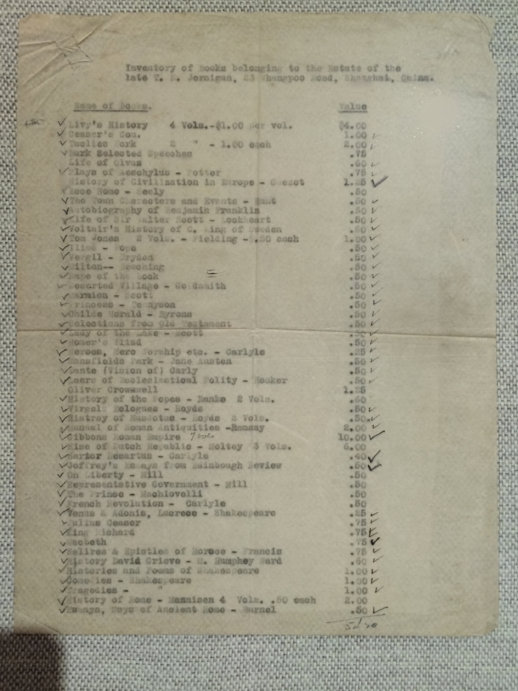 一份現(xiàn)存于上海孫中山故居紀念館的《已故T. R. 佑尼干遺產(chǎn)中的圖書清單》,共有5頁,列有200余種圖書及對應價格,部分書名旁還有打勾標記,見證了孫中山挑選藏書時的認真與審慎。據(jù)說,孫中山還與佑尼干之子保羅?佑尼干談判,購入了清單之外的稀見珍貴藏書。1923年1月,這批佑尼干舊藏正式被收入孫中山的莫利愛路寓所,成為孫中山藏書的重要組成部分。