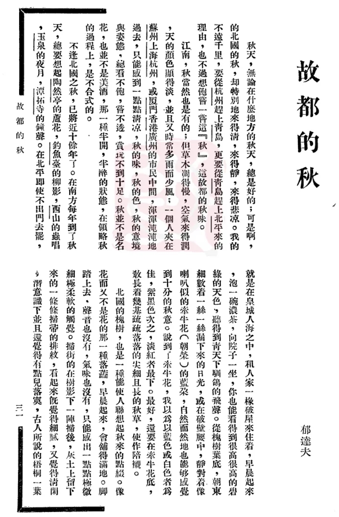 郁達夫《故都的秋》,1934年《當代文學》第3期