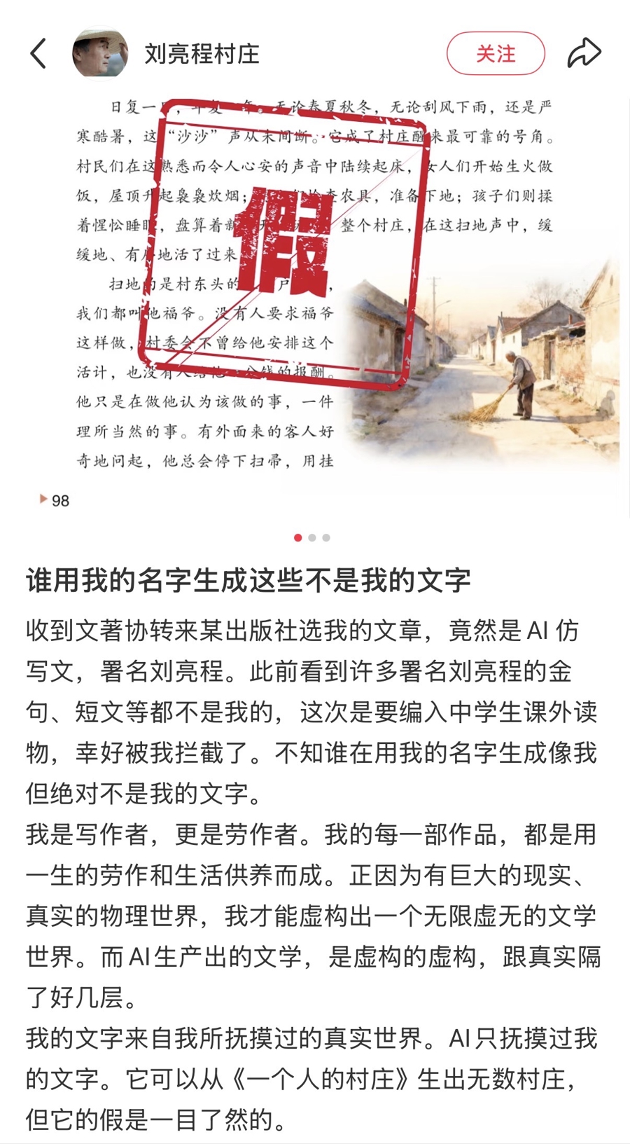 “誰(shuí)在用我的名字生成那些像我但不是我的文字?”4月1日晚,茅盾文學(xué)獎(jiǎng)得主、新疆作協(xié)主席劉亮程通過(guò)社交媒體公開與“AI劉亮程”的一樁“糾紛”:在收到某出版社委托文著協(xié)轉(zhuǎn)來(lái)編選其文章的請(qǐng)求后,作家發(fā)現(xiàn),這篇署名劉亮程的文章根本不是他寫的。