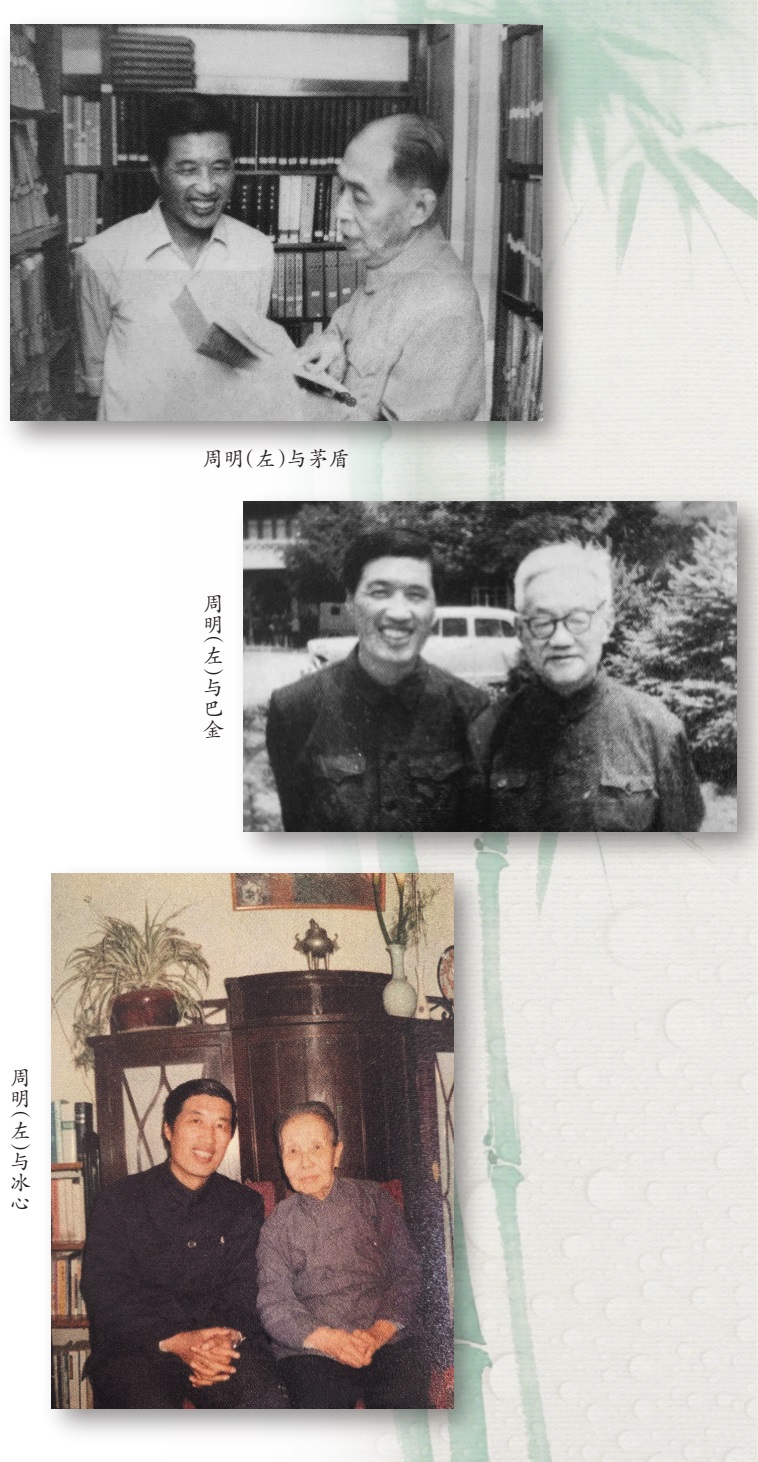 第一,記述與文壇大家的交往故事,以精彩的細節和難忘的鏡頭,回放了一幀幀令人難忘的場景,描繪了他們各具個性的精神風采和令人難忘的光彩形象。《人民文學》資深編輯的特殊身份、長于交往的性格,使得周明從20世紀50年代以來,與茅盾、巴金、冰心、趙樹理、張光年、李季、柳青等當代文壇大家有較多的接觸與來往。他在散文作品中,忠實地還原了歷史場景,生動地再現了當時的情景。如《茅盾與〈人民文學〉》等文章,記述了《人民文學》復刊之后,他去給茅盾呈送新出的刊物時,茅盾談起毛澤東主席當年為《人民文學》創刊題詞的情形。他還在茅盾家里看到茅盾珍藏的毛澤東主席寫給茅盾的親筆信。在記述文壇名家的散文里,他寫得最多的是冰心。文章以豐富而生動的細節,傳揚出冰心不老的童心和內在的幽默。比如他與冰心交談時說跟過去相比,冰心現在的文章有鋒芒了。冰心隨即回應說:“姜,自然是老的辣嘛!”在《冰心的晚年世界》中,他講到冰心與許多文壇巨匠的關系,他們之間既相互惦記,也彼此調侃,友情深摯又充滿情趣。
